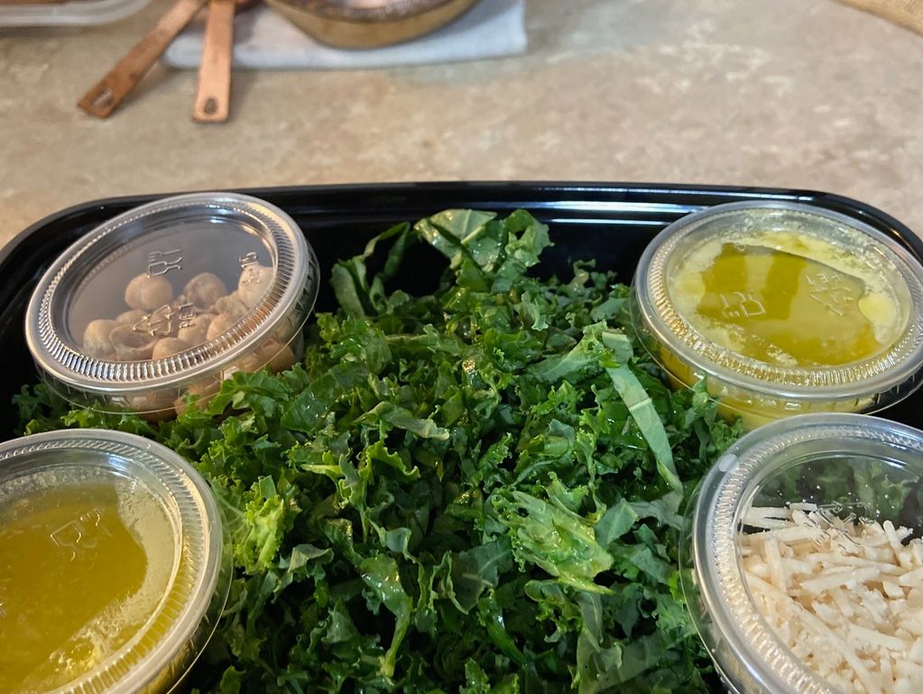 A delicious twist on a classic salad, featuring crisp kale, creamy Caesar dressing, crunchy chickpeas, and savory Parmesan cheese on the side. Perfect for any meal!