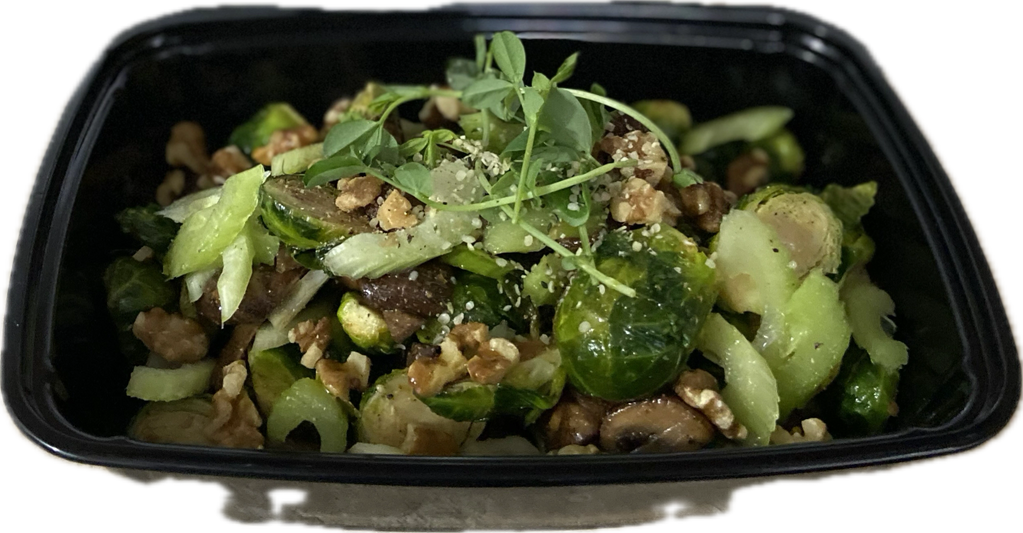 Ingredients include pearl barley, button mushrooms, Brussel sprouts, celery, fresh parsley, toasted walnuts, salt, black pepper, hemp hearts and extra virgin olive oil.
