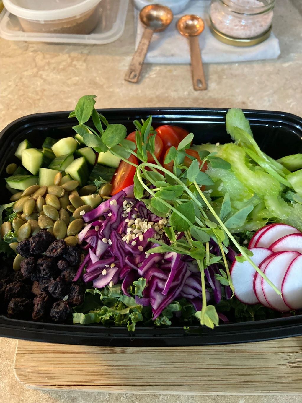 Ingredients include fresh green lettuce with radish, carrots, red cabbage, cucumbers, cherry tomatoes and chickpeas. Served with crispy chickpeas and super seeds (pumpkin & sunflower seeds and hemp hearts). Dressed with cider honey vinaigr